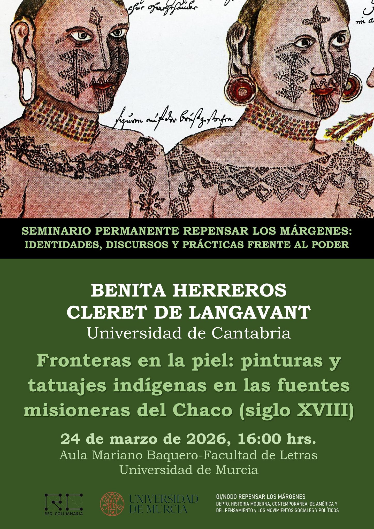 El Seminario Permanente Repensar los Márgenes es organizado por la Unidad de Investigación de la Universidad de Murcia Repensar los Márgenes : Identidades, discursos y prácticas frente al poder focalizado en las «limitografías» de la modernidad. En la edición del año 2026 Benita Herreros presentará la investigación «Fronteras en la piel: pinturas y tatuajes indígenas en las fuentes misioneras del Chaco (siglo XVIII).