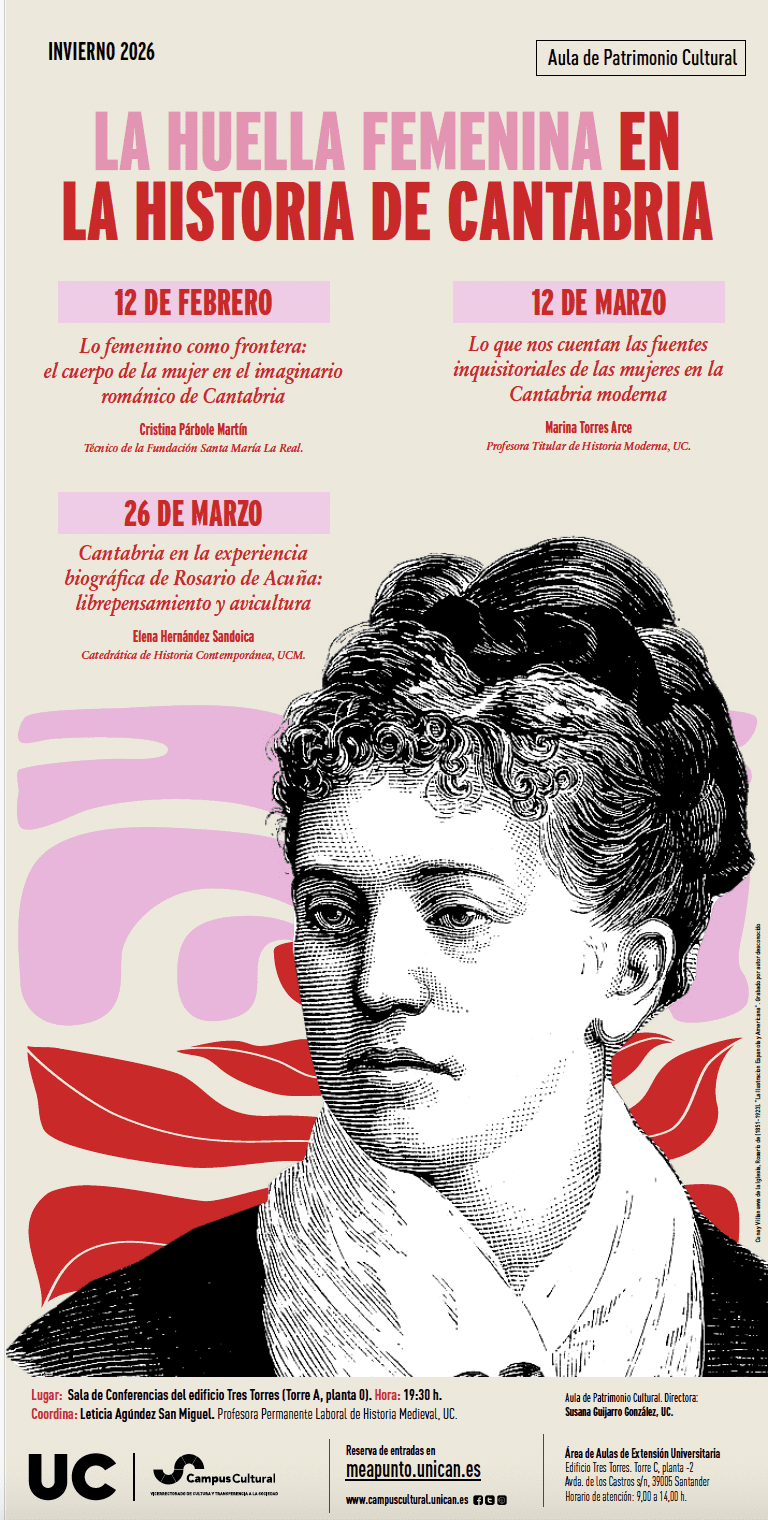 El próximo jueves 12 de marzo de 2026, Marina Torres Arce impartirá la conferencia Lo que nos cuentan las fuentes inquisitoriales de las mujeres en la Cantabria moderna, en el ciclo La Huella femenina en la Historia de Cantabria, organizado por el Aula de Patrimonio Cultural de la UC. El acto se celebrará en la Sala de Conferencias del edificio Tres Torres (Torre A, planta 0) en Santander, a las 19:30 h.