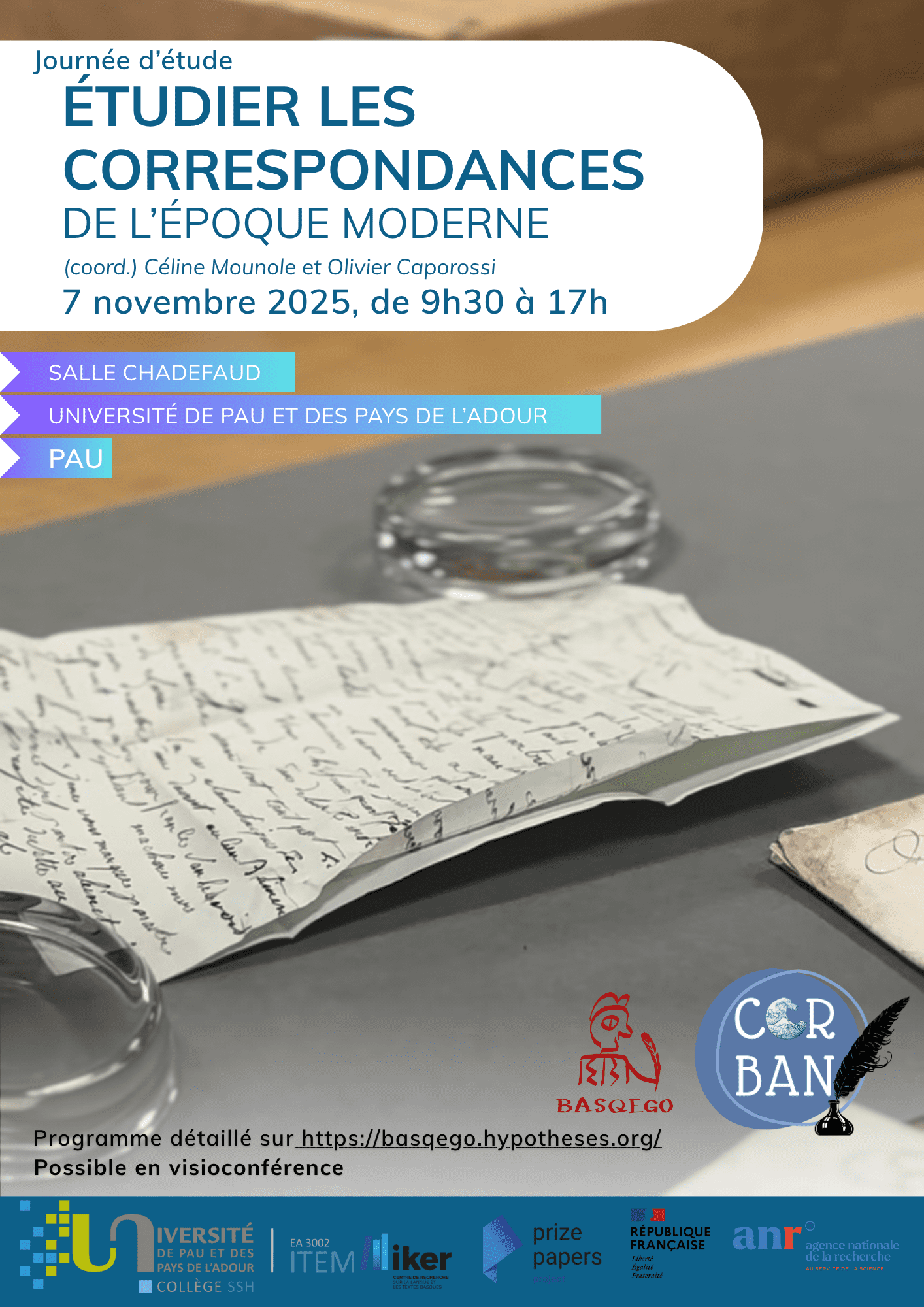 Pablo Sánchez Pascual participará el próximo día 7 de noviembre a las 15 horas en la jornada Étudier les correspondances de l’époque moderne, coordinada por los profesores Céline Mounole (IKER) y Olivier Caporossi (ITEM) en la Université de Pau et des Pays de l´Adour (Francia) con la ponencia titulada «En torno a los Prize Papers: hallazgos epistolares de naturaleza mercantil en la costa norte de España. Un estudio en curso». Esta jornada de estudio se celebrará en la Sala Chadefaud (Instituto Claude Laugénie, UPPA) de l’Université de Pau et des Pays de l’Adour de 9:30 a 17:00 horas.