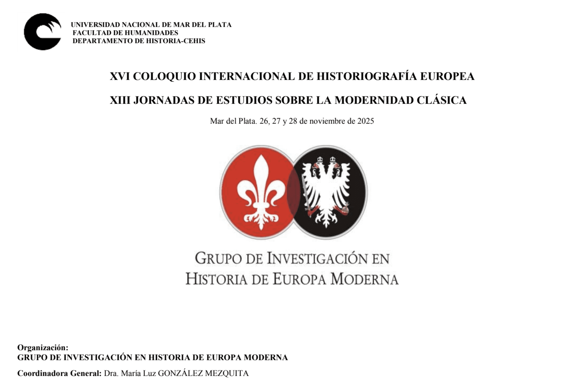Sebastián D. Sisto Reija participará el próximo miércoles 26 de noviembre entre las 9:00 y 11:00 (GMT-3) en el XVI Coloquio Internacional de Historiografía Europea. XIII Jornadas de Estudios sobre la Modernidad Clásica. Estas jornadas científicas tendrán lugar en la Universidad Nacional de Mar del Plata entre los días 26 y 28 de noviembre de 2025, y están coordinadas por María Luz González Mezquita.