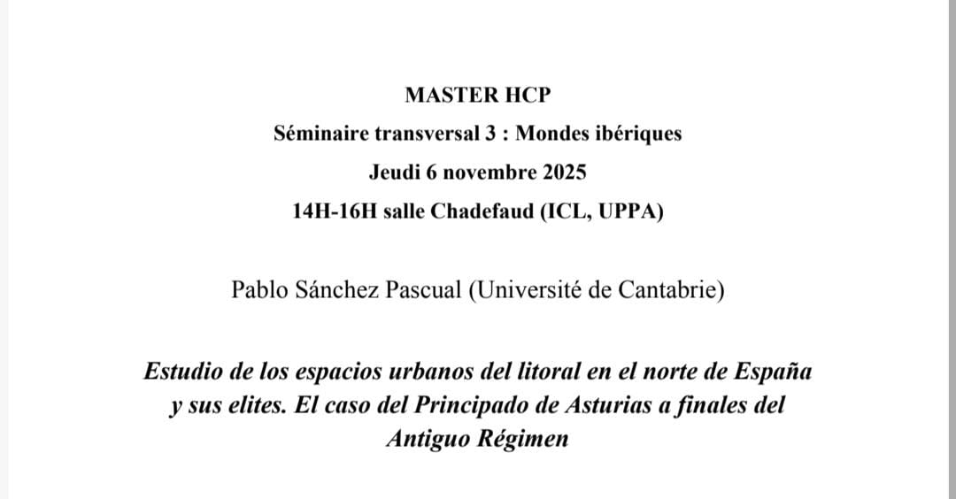 Pablo Sánchez Pascual va a participar el próximo día 6 de noviembre a las 14 horas en el seminario Séminaire Mondes ibériques organizado por la Université de Pau et des Pays de l´Adour (Francia) con la ponencia titulada «Estudio de los espacios urbanos del litoral en el norte de España y sus elites. El caso del Principado de Asturias a finales del Antiguo Régimen». Este seminario se celebrará en la Sala Chadefaud (Instituto Claude Laugénie, UPPA) de l’Université de Pau et des Pays de l’Adour de 14:00 a 16:00 horas.