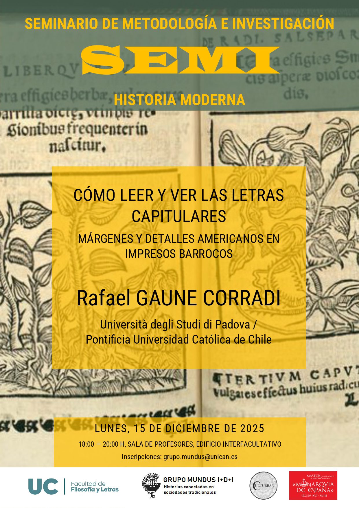 El pasado 15 de diciembre, el Grupo MUNDUS celebró una nueva sesión del Seminario de Metodología e Investigación (SEMI), dedicada a explorar las posibilidades de la historia cultural del libro y la imagen en la Edad Moderna. En esta ocasión contamos con la participación de Rafael Gaune Corradi, investigador de la Università degli Studi di Padova y la Pontificia Universidad Católica de Chile, quien nos invitó a mirar con otros ojos los impresos barrocos.
