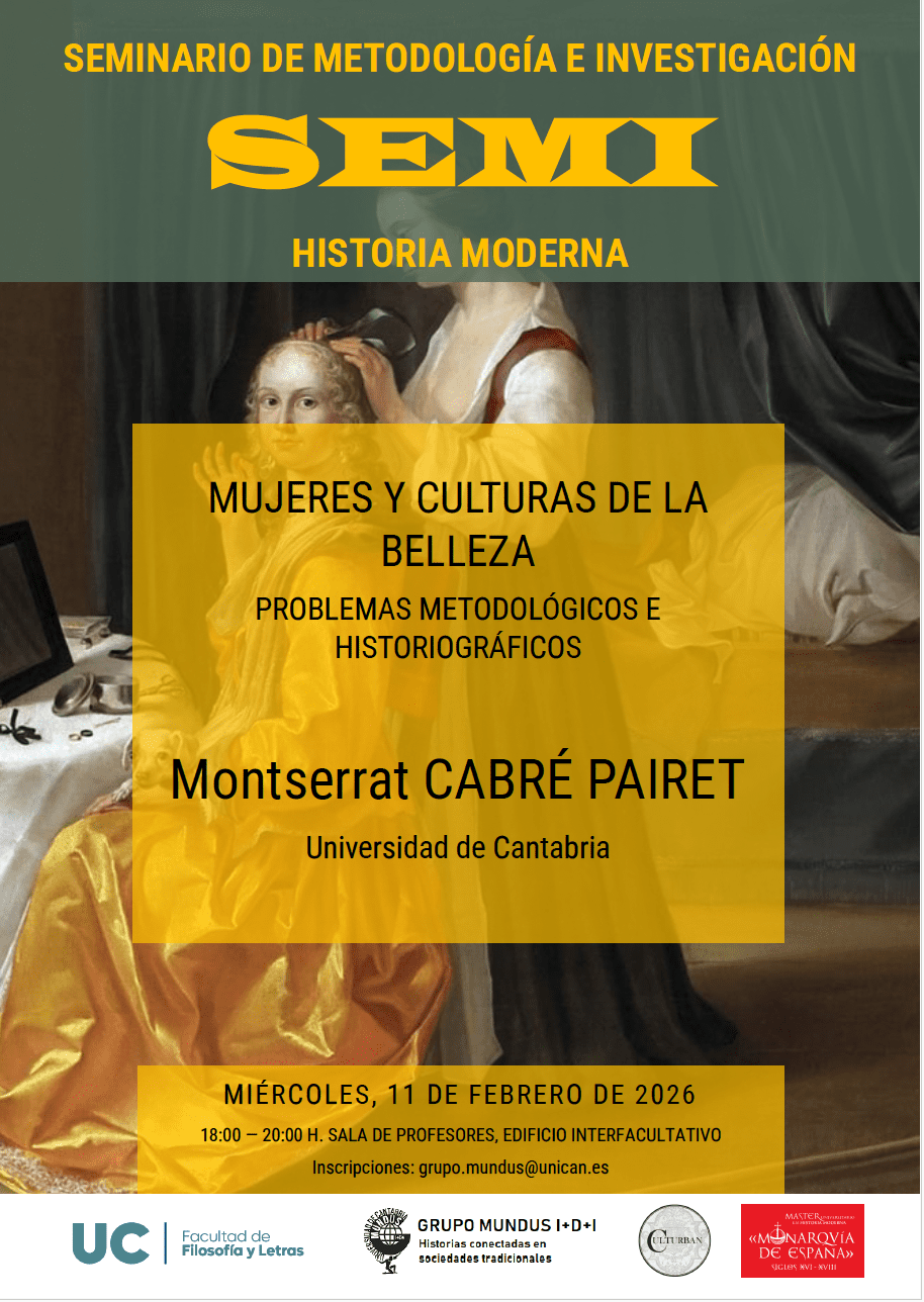 El próximo miércoles 11 de febrero a las 18:00 h, Montserrat CABRÉ PAIRET, catedrática de Historia de la Ciencia en la Universidad de Cantabria, impartirá la conferencia titulada “Mujeres y culturas de la belleza: problemas metodológicos e historiográficos” en una nueva sesión del XVI Seminario de Metodología e Investigación en Historia Moderna. La sesión se celebrará en la sala de profesores de la Facultad de Filosofía y Letras, en su horario habitual, de 18.00 a 20.00 h. y podrá seguirse ONLINE por Teams, previa inscripción por correo electrónico en grupo.mundus@unican.es